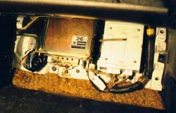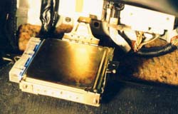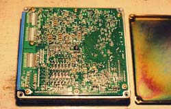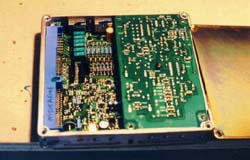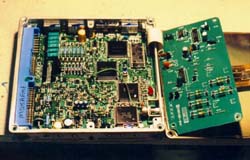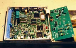 | Engine Basics: Internal combustion engines are, at the most basic level, air pumps.If you pump more air through them you will get more power. Thereare some little details that get in the way of this simplistic view, butit works well for this discussion. Turbo and Super chargers createpower by forcing more air through the engine. Porting and polishing,valve lift and duration, and all the other little tricks create more powerby forcing more air through the engine. Intercoolers and cold airinduction systems create power by making the air that is forced throughthe engine more dense, which means more air is forced through the engine. Trick exhaust systems allow the air to leave the engine faster which meansmore air can be forced through the engine. There are three things needed for an engine to run; air, fuel, and spark. The ECU measures how much air is flowing into the engine, controls howmuch fuel is sent to each cylinder, and when the mixture is burned. The ECU also measures the oxygen content of the exhaust so that it cankeep the mixture of air and fuel at a safe (and efficient) level to minimizedetonation while maximizing power. Why the ECU programming is important: Nissan engineers were given a specific set of operating parameters forthe VG30DE(TT) engine. They wrote a map of fuel/air/timing settingsto match the parameters given. This did not include the performancegoodies we add to our cars. The operating parameters for the stockECU setup cover 0 - 7000 rpm, 0 - 155mph, 0 - 300 hp, 92 octane gas. Whenthe engine operates outside of these assumptions, the ECU does not havethe information needed to make a safe and efficient setting of the fuel/airmix or ignition timing. It will make assumptions and the engine willrun, but it will not be at an optimum level. On an otherwise stock 300ZXTT, increasing the boost level will increasepower dramatically. It will also increase the risk of detonation. Detonation will do some damage to the engine every time it happens. It may be as simple as erosion of the spark plug electrode or as drasticas a hole in the piston. If detonation occurs for a long enough time,it will destroy the engine, possibly beyond repair. Some ECU reprogramming companies simply remove the top speed limiterand assume the driver will not drive really hard very often and not destroythe engine. Others will simply increase the amount of fuel deliveredat full throttle, while this will limit the possibility of detonation itwill not be efficient and may not give maximum power. Jim Wolf Technology rewrote the entire fuel/air/timing map to optimizethe settings for power. They also greatly expanded the size of themap to provide settings far beyond the stock map. They have customizedsetups for just about every combination of aftermarket performance goodiesavailable on the market. I have seen JWT chips for cars with twinintakes and 370cc, 485cc, and 555cc injectors; all of the above with nitrousinjection; all of the above with 100+ octane race gas. You get mypoint. JWT also took the additional effort to get the standard programcertified by the CARB so it is legal to install in cars operated on thehighway in all 50 states. I am not aware of any other ECU reprogrammerthat has made that effort for our cars. While having a JWT chip in your ECU will not guarantee you won't getdetonation, it is far less likely than with most of the other ECU chips. Steve Simmons Installation: What would a modified TT be without upgraded software? Heh! Not nearlyas much fun as it could be! Jim Wolf is the dominate manufacturer of aftermarketECUs for Nissan vehicles & is the unit I installed for this page. Swapping the ECU: Installation is simple & takes about 15 minutes to do. 1. Disconnect the negative battery terminal & make sure that itcan't reconnect. 2. Remove the passenger side floor mat & peel the carpet from thetop of the firewall down. It's held on with some velcro to a wooden panel(1.). Remove the 4 bolts holding the wooden panel to the firewall& pull it out. (2.) 3. There are three bolts holding the ECU's mounting bracket to the firewall,remove them to 'flip' the ECU out of it's hiding place. (3.) Unscrewthe bolt holding the blue plug into the side of the ECU, this should freeup the ECU & mounting bracket. (4.) 4. Remove the 4 screws holding the ECU in the mounting bracket. ExchangeECUs & reverse the steps to re-install. NOTE: Make sure thatthe blue plug is seated evenly all the way across. Just because the boltis tightened doesn't mean the plug is seated... Here are some other views of the inside of the ECU if you should everhave to switch chips out: NOTE: ***Before doing anything tothe inside of the ECU, make sure you understand ESD. ElectroStaticDischarge is a killer of sensitive electronics.Your body is capable of storing enough electrical charge to toast certaincomponents. If you own a grounding strap, use it. If not, make sure youhold onto something that is grounded (you basically want to shock yourselfon something other than the ECU!) to prevent ESD.*** This is the inside of a '90 model ECU. There are some differences fromyear to year. The second board hides the modified EPROM (5.) &must be unscrewed to swap it out, it's attached to the main board by aribbon cable. 'Flip' it over to the side, exposing the EPROM (6.)The chip with the white sticker on it is the JWT EPROM. The EPROM comesout by gently pulling from the two ends that don't have pins coming out.Be EXTREMELY careful when doing this to pull the chip straight up, otherwiseit's possible to bend or worse yet, break off the delicate pins! When placingthe chip in the empty socket (7.) make sure the end of the chipwith the 'notch' in it is toward the end of the socket with a notch too,you can also look for the trace numbered 1 coming out from under the socketon the board. Because I was already there, I took off the back of the ECU(8.) to look at the quality of JWT's work... first class! Installing the Boost Jets: The ECU doesn't do much withou