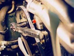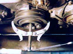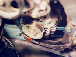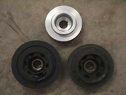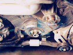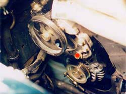 | The underdrive pulley is a product that is verynew to the Z scene, it's been available for domestics for a long time.Basic concept for hp gain it two-fold: 1st, the pulley has a smaller diameter(1.), which is a mechanical advantage. It changes the ratios between the crank and the accessories, actually driving them slower, reducing 'parasitic drag' on the crank from driving the accessories. 2nd, it is made of aluminum,instead of iron. This weight reduction improves hp, because it is less weight the crank has to rotate. The stock pulley weighs about 13 lbs forthe TT, a little less for the NA (in 1. the underdrive pulley is at the top, a TT pulley on the left and a NA pulley on the right), The underdrive pulley weighs in around 3.5-4 lbs. Each lb. of mass taken off the crank/eccentric shaft is worth approximately 2.7 HP and the figure increases with forced induction and as RPM's increase. The Downsides: 1st, the speed reduction on the accessories might not meet the driving demands.Alamo Autosports tested voltage output of the electrical system & foundonly a .1v drop in current under full load. After a year of people drivingwith pullies in warmer climates, there's been substantial evidence theA/C is up to par. One thing to understand is the minimums are met at idle,so if the engine is anywhere above 850 rpm, then there shouldn't be anyissues with the lowered accessory pulley speed. High powered mobile audiocould possibly effected depending on power draw. 2nd, the weight reductioncauses loss of inertial energy, the same way the aluminum flywheel does,there isn't enough inertia to maintain a constant rotational speed, whichmakes it a *little* harder to drive, with a few minutes of driving thedifference will be negligible. 3rd, the pulley also is without the 'harmonicbalancer/tortional damper' ... if the crank isn't within certain tolerances(tight factory spec.) it could cause a 'wobble' in the crank, leading topremature bearing wear. Z cranks are manufactured to tighter specs thanmost American made cranks, running without the balancer shouldn't posea problem. NOTE: I am still skeptical of longevity hazards here, but likemost performance mods, you sacrifice some reliability/longevity for higherperformance levels... Special thanks to Vince @ Courtesy Nissan for belt PNs & Kyle@ SGP for belt PNs & review of the procedure. Timing: Anytime the radiator is out of the car is acceptable...like 60k maintenance. This one is installed on my '95TT. Special Tools: - 27mm socket