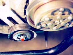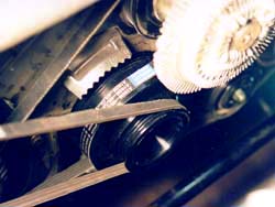 Installation:1. Get the front of the car in the air, about 16-18". Make sure alljack stands are properly placed, or better yet, use ramps on the frontwheels, & all safety measures are taken. Make certain the rear wheelsare e-braked & chocked, the crank will be wrenched during this, sothe car moving off the stands is definitely possible if these steps aren'ttaken. 2. Remove bottom engine shielding (6 x 10mm). Drain the radiator (2.)by removing the radiator lid and the 'vent plug' on the opposite side ofthe radiator (1 x phillips). The plastic petcock on the lower back sideof the radiator is poorly designed and I have only met up with 1 that workedcorrectly. Just unscrew it until fluid starts dribbling out into the bucket.Let it go until done, then move the bucket under the lower radiator hosewhere it goes into the radiator. Remove the hose from the radiator (1 x10mm), hopefully the rest of the radiator fluid will make it's way intothe bucket & not onto the floor. 3. Pull hoses off coolant tubes on the front of the engine, then removebolts holding radiator retaining clamps (3. dot shows bolt head)in (2 x 10mm). Remove the lower radiator hose from the bottom of the car,minding where left-over fluid will end up. Remove the bottom part of fanshroud (3 clips). Remove the overflow hose from the radiator (right belowand behind the radiator cap) neck and clips on the side of the radiator.Tuck the hose off to the side and don't let it fall down. It will drainthe remote coolant resevoir. Remove the radiator. 4. Remove radiator fan (4 x 10mm) & fan clutch (4 x 10mm). 5. Loosen belt tensioner (1 x 12mm) on the power steering pump, thenloosen the bolt slightly on the power steering pump mount (4. dotshows where the bolt head is) (1 x 14mm). This bolt is accessed throughone of the holes in the pulley. Shift the car in neutral and put the torquewrench on the crank bolt to rotate the pulley where the bolt is accessable.Make sure to put the car back in gear afterwards. Loosen the tensionerlocking bolt (5. dot shows where bolt is) (1 x 12mm). 6. Loosen belt tensioner on alternator (1 x 12mm), then loosen boltslightly on the alternator mount (1 x 17mm) & tensioner locking nut(6. dot shows the back side of the tensioner lock) (1 x 12mm). 7. Loosen belt tensioner on the A/C compressor idler pulley (1 x 12mm),then loosen bolt on idler pulley (1 x 14mm) (7. dot shows lockingnut on the idler). 8. Remove all three belts. 9. Remove crank bolt holding the pulley (1 x 27mm). An air wrench willmake this simple, otherwise put the car in fifth with the parking brakeon & do it the old fashion way. Leave the bolt in, but loosened, ithas a detent in the head of it for the pulley puller to ride in, keepingyor threas from being harmed. Then use a pulley puller to remove the crankpulley (8. & 9.). Be careful not to loose the woodruffkey in between the pulley and the crank. It is there to maintain alignmentbetween them. 10. Install the new pulley. Make sure to get the pulley lined up onthe woodruff key. Retorque crank bolt to 165lb. 11. Install new size belts, then assemble in reverse order. To get thepower steering belt al the way on, shift the car in neutral an put thetorque wrench on the crank bolt again to 'rotate' the belt onto the pulley.Make sure belt deflection is no more than 1/2" on the power steering belt& no more than 1/4" on the others at any midpoint after tightening,this is for new belts only (10.). More than likely, they will requiretightening after a few days of use. The belts will squeal on start-up tolet you know when. 12. Replace coolant by filling the radiator, then starting the car &letting it idle while continuing to fill as required. Watch the coolanttemp needle while driving the first couple minutes to make sure the carisn't running low on coolant.Don't forget to check the coolant level inthe overflow tank. REV: 1-9-2000