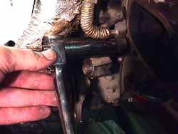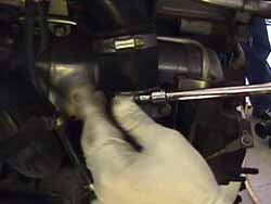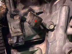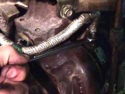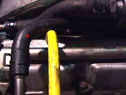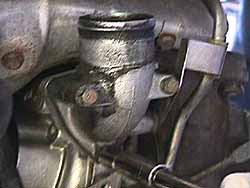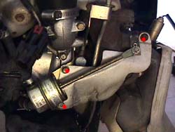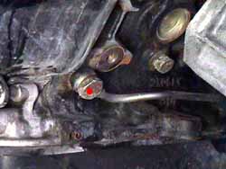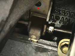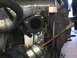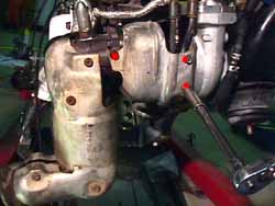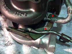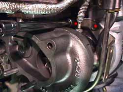 | Moreair flowed through the cylinder equals more potential horsepower. Sincethe turbo Z depends on forced induction to keep up with higher displacementengines, the easiest way to raise the bar is to install larger turbos tomove more air. For a few dollars more then the OEM turbos, a set of Sport500s can be purchased as replacements. Considering the amount of laborinvolved in this, it's pretty senseless not do perform some sort of upgrade.The service manual's turbo removal section indicates the turbos can bereplaced with the engine in the car. While this is true, with the propertools it's much quicker to remove the engine and do the job outside thechassis. This way the newly installed turbos can be torqued to all appropriatespecs, leaving nothing on the installation to question. I personally knowpeople who have done it by the book. I tried & realized the passengerside is hard, the driver's side is seemingly impossible. Save a lot offrustrated hours and pull the engine. It's also a great opportunity todo some other maintenance items. This install is on Shahram's '93 TT. Timing: When the urge strikes & the pocket book is fat, this is thebest time. Or when the exhaust is smoking and the diagnosis is turboseal failure. Parts: 2 turbos, custom, or OEM PNs 14411, 14411+A 5 Rubber water feed lines, PNs 14056W, 14056WB, 14056WA, 14056WC, 14056WD 4 Metal water feed lines, PNs 15192P, 15192R, 15192PA, 15192RA 10 Total copper seals, all PN 15188A 1 Copper seal (listed as two PNs) PN 15192G for the passenger oil feed 2 Oil feed lines, PNs 15192+A, I recommend 15192 & 15192+B as a 2 piece line, while 15192 can be a single piece line. 2 Oil return gaskets, PN 15196 2 Oil return rubber hose couplings, PN 15198 2 Intake inlet gaskets, PN ***sec.165? listed*** dunno 2 Intake outlet gaskets, PN 14456M 2 Metal turbo flange gaskets, PN 14415 2 Metal precat gaskets, PN 14445 Special tools: 1 ton engine hoist or stronger engine stand Procedure: 1. Remove theengine (Details). 2. Clean theengine, particularly the areas around the turbos to ensure no debris enterthe new turbo housings. Engine dergeaser or brake cleaner works well. On the driverside: 3. Remove theheat shield (3 x 10mm) (red dots in 1.). Remove the precat (2 x13mm nuts, 2 x 13mm bolts). 4. Remove theupper hardpipe & rubber hose coupling (1 x 10mm & 2 x hoseclamps)(2.). Remove the intake outlet (3 x 10mm & 1 x 10mm for waterfeed line bracket) (3.). Disconnect the boost solenoid vacuum linefrom the intake inlet. Remove the intake inlet (2 x 12mm). It's easy toget to this with an extension from the front. Disconnect the vacuum linefrom the wastegate actuator. 5. Trace thewater lines going from the turbo. They go from the sides of the turbo upwardto the block. Disconnect both rubber water lines (4 x hoseclamps), or cutthem if replacing (recommended). Note the shape and orientation of eachhose. Remove the water feed banjo bolt (1 x 19mm) on the outside of theturbo (red dot in 4.). Remove the bolt holding the line to the backof the block (1 x 10mm). Remove the ouside water line. 6. Remove the AC compressor bracket from the block (3 x 14mm, 1 x 12mm, 1 x 8mm). Removethe oil feed banjo bolt (1 x 19mm) from the block (red dot in 5.)behind it. Remove the midway oil feed line bracket on the motor mount (1x 14) (red dot in 6.). Loosen the oil feed line from the turbo (1x 12 tubing wrench). 7. Loosen thehoseclamps on the oil return line to the oil pan. 8. Bend backthe tabs on the turbo flange nut locking plates. The Nissan design on thesethings is poor. They should have made the tabs longer to allow gettinga screwdriver on them a little easier. Instead they are shorter then theheight of the nuts, making them difficult to pry back. Remove the turboassembly from the exhaust manifold (4 x 13mm). Remove the oil feed line(1 x 12mm tubing wrench). Remove the remaining water line from the turbo(1 x 19mm). Remove the oil return line (2 x 12mm) from the bottom of theturbo. 9. Installoil return line on bottom of new turbo with gasket (2 x 12mm), make sureit's pointing the right direction. Torque to 12-15 ft-lbs. 10. Installthe oil feed line (1 x 12 flare nut). Approximate the angle needed to fitthe lines back in place on the block. Tighten to 11-13 ft-lbs. There weretwo different models of oil feed tube available when I did my turbos, a1 piece (2/90+) and a 2 piece (7/89-2/90) version. I found the 2 pieceto be a little easier to work with. NOTE: Makesure the 10mm plug is in place in the bottom of the block area of the oilfeed line. It's very easy to overlook. 11 . Installthe inside water feed line (1 x 19mm banjo bolt). Make sure the tubingloop under the turbo is parallel with the housings. The heat shield willcradle it when it's installed. Torque to 11-14 ft-lbs. 12. Installthe outside water feed line (1 x 19mm banjo bolt). Get the bolt started,but leave the line loose, so it's mobile to get wrenches around to tightenthe mounting nuts. 13. Replacethe rubber coupling hose for the oil return line on the oil pan. 14. Installthe turbo and new metal gasket on the exhaust manifold, make sure to getthe oil return line in the rubber coupling hose. Hang the turbo by a singlenut on the rear of the flange. Tighten that nut to mate the flanges. Doublecheckall the line angles to make sure everything will fit properly. Make whateveradjustments necessary. 15. Installthe locking plate that doesn't look like the one in picture 7. (theone pictured is for the rear flange), on the front studs of the manifold,replace the mounting nuts (2 x 13mm). Use anti-sieze compound on the nuts.Snug them up. Remove the single nut from the rear of the flange, installthe locking bracket in picture 7. replace the rear mounting nuts(2 x 13mm). Torque all 4 nuts to 32-40. Bend the locking tabs down on thesides of the nuts. 16. Positionthe outer water feed line. Bolt the brace on the back of the block (1 x10mm bolt). Torque the banjo bolt (1 x 19mm) to 11-14 ft-lbs. 17. Bolt themidway oil feed line bracket o
