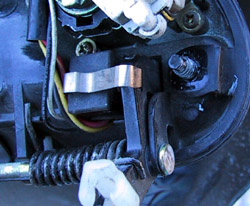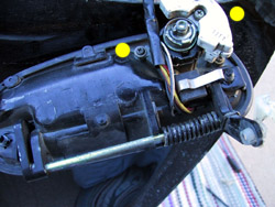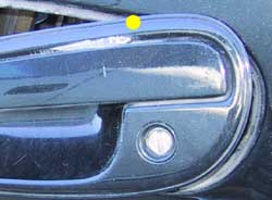 | After many years of use, the stock Z32 door handles can succumb to wear and tear. For this technical document, I had broken my lock cam preventing me from unlocking my door with the key. The following article was documented on a '91 5spd TT. Tools: 10mm 1/4" drive socket with extension(s). 10mm open end wrench. #2 Philips screwdriver. Needle Nose Pliers. Flashlight Parts needed: Replacement parts are to be determined upon removal and inspection. Nissan only sells complete door handles which include everythingneeded. Color matched door handles are roughly $150.oo US dollars each. * I was able to disassemble a door handle from a spare door I have, and use it's good parts to replace my broken parts. Similarly, a door or door handle from a salvage yard might have everything needed. Estimated Time Required: Approximately 2 Hours per door. Procedure: 1. To gain access to the door handle, follow this article to remove the door panel; ZHome.com Door Panel Removal Tech(see "removing the front speakers" section). Also, It is important toraise the window completely, so reinstall the driver side windowcontrols before proceeding. 2. Remove the 1" diameter grommet just above the latch mechanism (1.).Using the 10mm 1/4" drive socket, carefully remove the 10 mm nut fromthe door handle. It is necessary to use a thin wall socket to get tothis nut properly. This can be tedious and time consuming. A flashlightis a great aid. Take precautions to not let the nut fall off thesocket, or the socket fall off the extension. 3. Remove the 10 mm nut accessible by using the open end wrench (2.). This will free up the door handle completely. 4. Very carefully, pull the door handle away from the car while twisting it into the approximate position shown (3.).Continue to twist the door handle (carefully!) and lift the door handlemechanism. Lifting the door handle will free the upper door handleactuating arm (4.) and allow the door handle assembly to be pulled out of the door. 5. Again, very carefully, remove the actuating rods from their white plastic retainers (4.).The retainers should rotate off of the actuating rods. Breaking eitherof these will effectively ruin any chances of a successful repair ofany part of the door handle. The door handle should now be free, otherthen the wire harness. Note: The entire handle can be removed by disconnecting theharness at the connecter just forward of the seatbelt return mechanismon cabin side of the door. I chose not to as the harness goes throughseveral plastic retaining clips. 6. Remove the door lock cam by removing the C-Clip (upper yellow dot 5.) 7. Remove the vehicle alarm sensor (large white object) by removing the screw (right dot 6.). When removing the alarm sensor, take caution in not bending the metal tab residing within the alarm (red dot 5.). 8. Remove the door lock tumbler. The lock tumbler is held inplace by a large wire spring encompassing the entire barrel of thetumbler (lower yellow dot 5.). 9. Once removed, all that is left is the key hole light switch,and key hole light bezel. Take extreme caution here as the key holelight bezel is usually very fragile. The light bezel is held in placeby the small screw (left dot 6.) Using your index finger, push the light bezel out through the back side (where the lock used to reside). 10. There is no need to remove the key hole light switch. Ourcars from the factory would sense when the door handle was pulled, andwould illuminate the door key hole lights, and the steering column keyhole light. After years of use, the switch can fall out of 'alignment'with it's actuating piece of metal ribbon (7.). Use a pair of needle nose pliers to tweak the metal ribbon until it functions properly again. 11. Reassembly of the door handle is in reverse order and withless difficulty as the actuating arms snap easily back into theirplastic retainers on the handle, once the handle is set in the positionshown (4.). In review, there are 5 servicable parts of the door handle, repaired, or replaced; a. the full metal door handle housing seen from the outside, including the sprung door handle b. the key tumbler c. the key hole light bezel d. the key hole light switch e. the factory alarm sensor And as an additional note; The door handle can not be adjusted to prevent rubbing (8.)as there is no mechanism to allow adjustment. Both the door handle, andthe door handle housing are made of a very hard cast metal (steel?). Itried manipulating the handle with a various tools without success. Originally published 01-15-2003