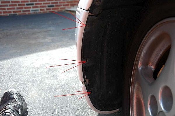 Pick a side to start on, and turn the steering wheel to expose the three phillips head screws which hold the wheel well lining to the edge of the front bumper. Using a #3 Phillips head screwdriver, remove them.