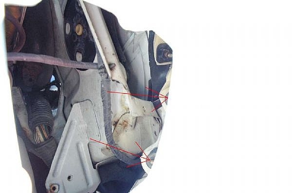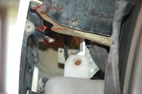 Pull back the wheel well liner that you unscrewed in step 1. Behind here are three more 10mm head bolts that fasten the bumper to the fender. An extension for your socket may aid removal of these three bolts.