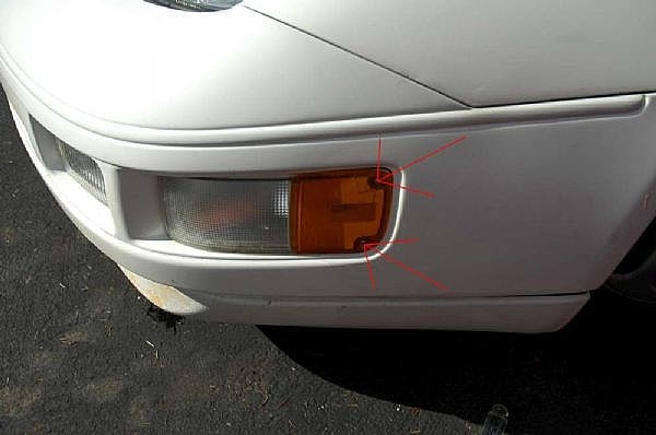 There are two remaining fasteners holding the bumper to the fender. These are most easily accessed by removing the turn signals. To remove the turn signal, simply unscrew the two Phillips head screws at the back of the light, remove the light, then unplug the harness.