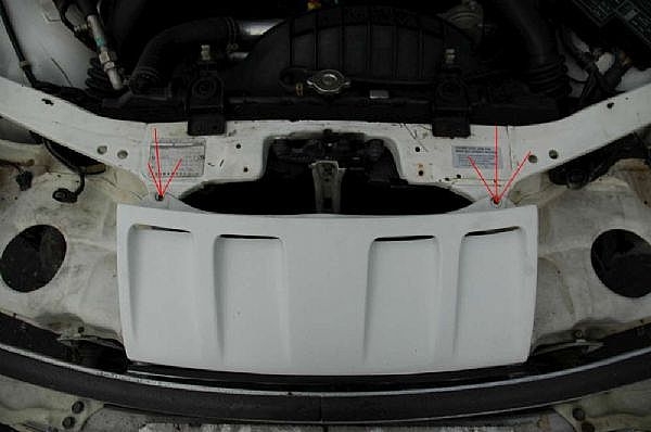 Remove the nose panel located between the head lights by popping the hood and removing the two 10mm bolts at the top of it. Once these are removed, the panel just lifts out.