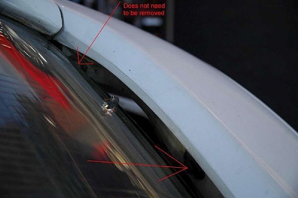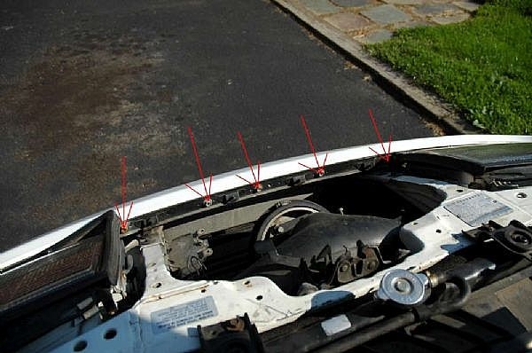 In front of each headlight there is one more bolt to remove. If the rubber trim to the headlights isn't removed already, remove it to expose the bolt.