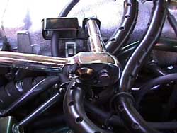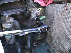 12. Remove the upper radiator brackets (2 x 10mm) & lean the radiator towards the engine to snake the low speed driveability kit's hose inbetween the hardpipes and the radiator, to get it from the 3rd opening on the plastic 'T' fitting to the surge valve up front. Be patient, there is a way to get it through there. In the last pic of the installed twinpop, I have this hose running over the top of one of the pops. I had done this for a temporary install, later I did the 'around the radiator' install. Loop the end of the hose under the recirculation canister.