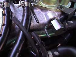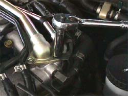 11. Install the plastic 'T' fitting with the orifice towards the front of the engine, with the 90 leg facing the fender into the new rubber hoses. Install the rest of the idle air tube (2 x 12mm & 2 clips). The cruise control bracket probably wont fit back on (10.), I left it off (1 x 10mm). Reconnect the 2 small vacuum lines above the 'T' fitting (15.). Tighten all the clamps. Attach the long low speed driveability hose to the third outlet of the plastic 'T' fitting. Tighten the hoseclamp on it.